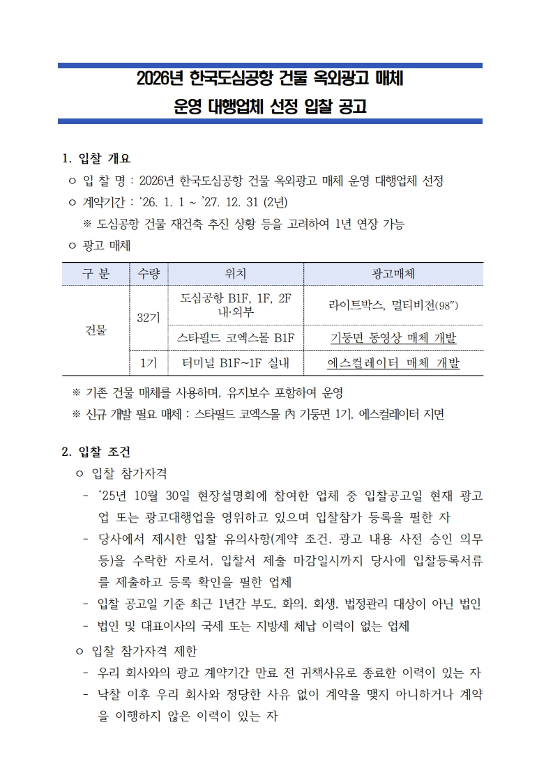 | 파일첨부 : 1-1. 2026년 한국도심공항 건물 옥외광고 매체 운영 대행업체 선정 입찰 공고.pdf 1-2. 2026년 한국도심공항 건물 옥외광고 매체 운영 대행업체 선정 제안요청서.hwp | |