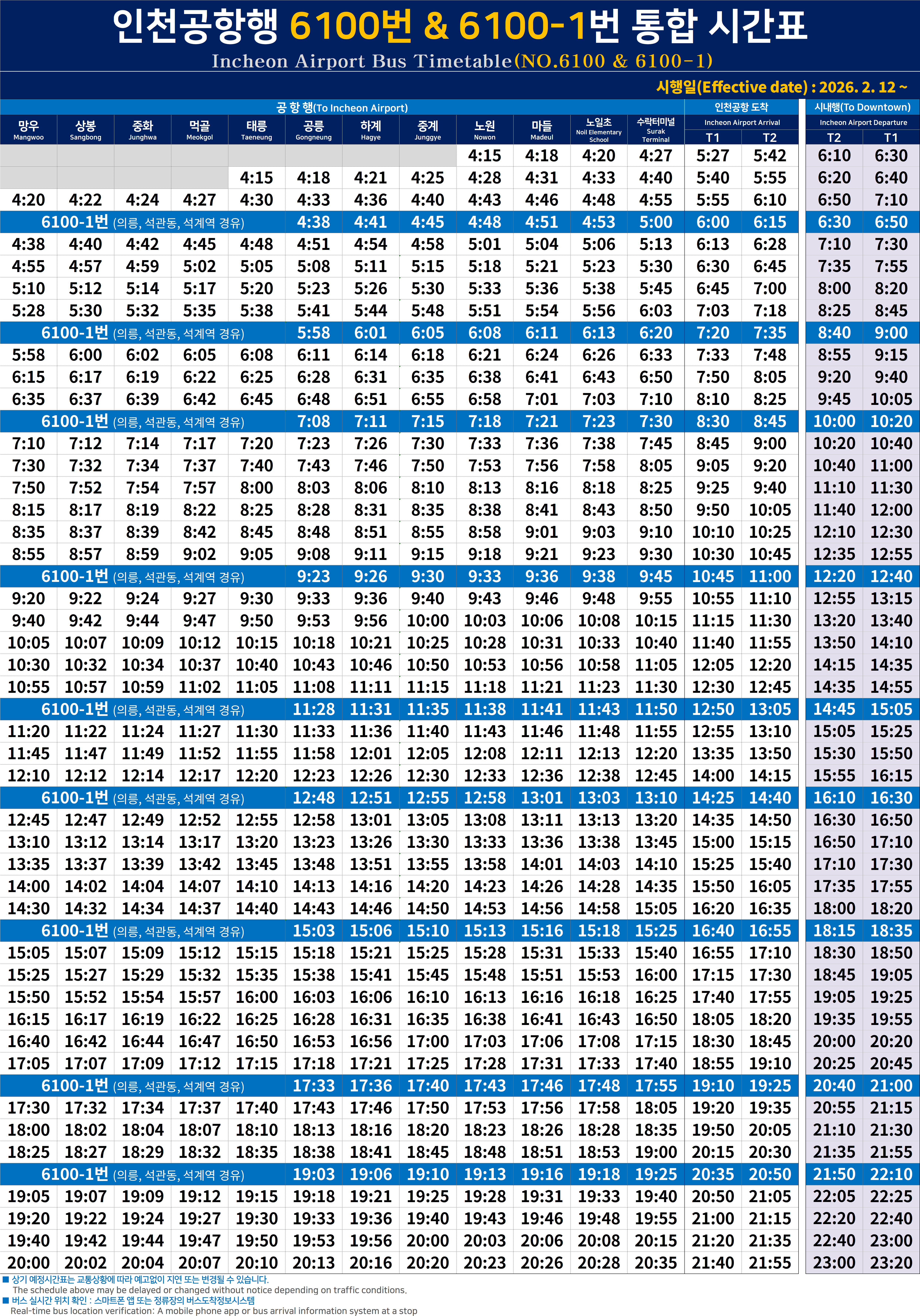 인천공항 6100번 & 6100-1번 시간표 변경(2026.2.12부터)