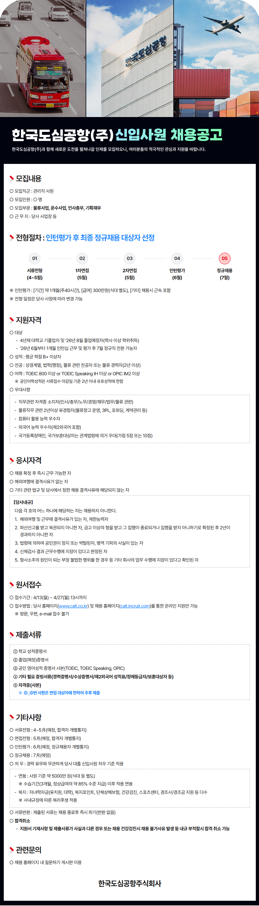 2026년 한국도심공항(주) 신입사원(관리직) 채용 공고