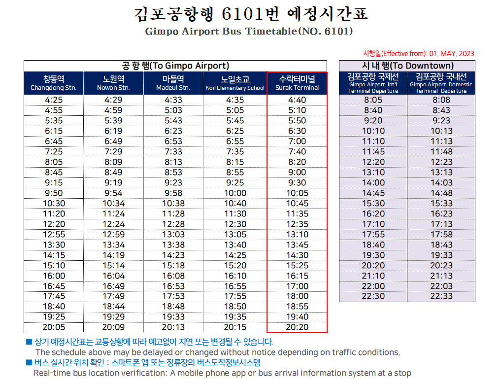 창동·노원 ↔ 김포공항 6101번 5월 시간표 입니다.