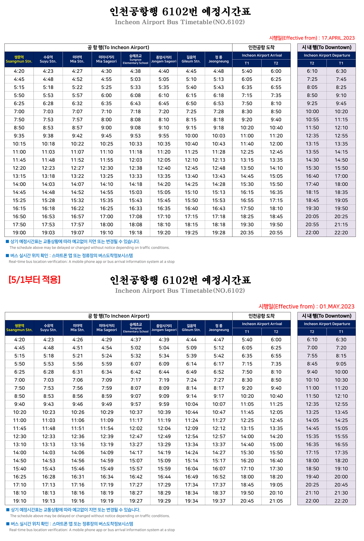 인천공항 6102번 5월 시간표 (5/1부 변경 전/후 공지)