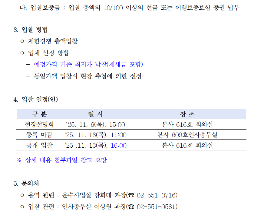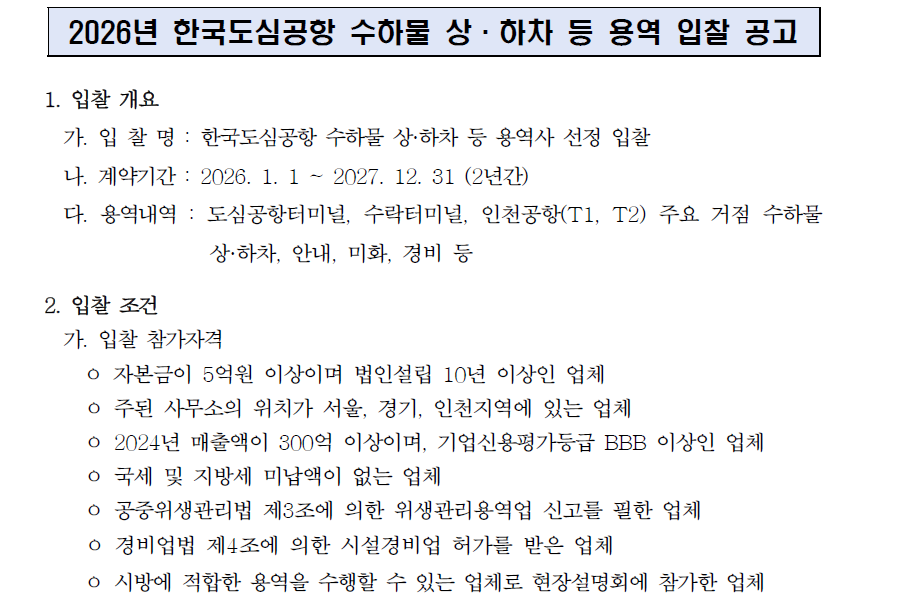 | 파일첨부 : 1. 입찰 참가신청서(25년).hwp 2. 2026년 한국도심공항 수하물 상하차 등 용역입찰 현장설명회, 입찰자 유의서.pdf 3. 2026년 용역 시방서.pdf | |